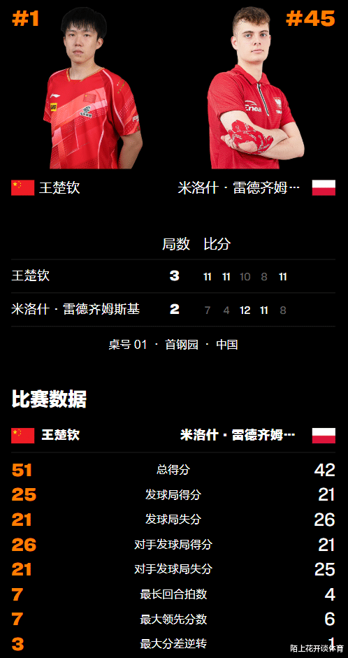 本场比赛欧洲超新星米洛什·雷德齐姆斯展现出了自己的冲击力,但是王楚钦靠着更强的综合实力,以大比分3-2获胜,晋级中国大满贯男单十六强。