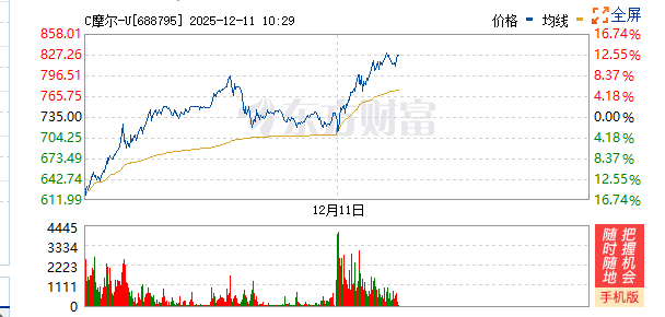 12月11日,近期备受关注的“国产GPU第一股”摩尔线程延续强劲表现,大幅高开,一度涨至830元/股。截至上午10点23分,摩尔线程大涨超11.7%,股价突破800元大关,现报821元/股,总市值也来到3850亿。